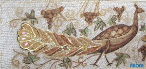 El mosaico de nuestro Altar -regalado su trabajo por el artista- representa dos pavos reales comiendo en una cratera, con una esplendorosa exhibición cromática, en un fondo de pámpanos y racimos. Es maravilloso.