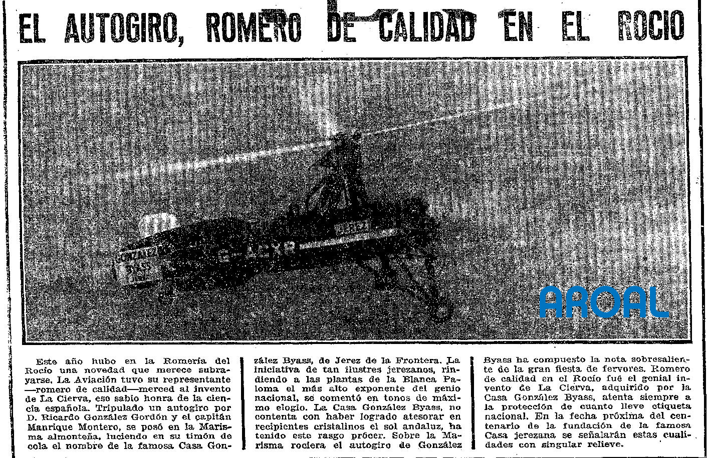 Fue aquel un rocío muy especial y revolucionario por varios motivos. La aldea recibió la visita del primer autogiro que aterrizó entre la admiración y algarabía de los romeros, en su cola lucía un gran letrero de Gonzales Byas, las bodegas jerezanas celebraban sus cien años de vida y  el aparato era pilotado por Ricardo Gonzalez Gordón, uno de los dueños.