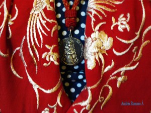 La medalla del primer Hermano Mayor efectivo, don José María Boza Domínguez, siendo Hermanos Mayores Honorarios: don Juan Vides Álamo y don Luis Arroyo Valero. La llevaba colgada en su cuello Ana María,hija del Hermano Mayor fundacional y unica descendiente directa de los tres fundadores que asistió a la Misa.