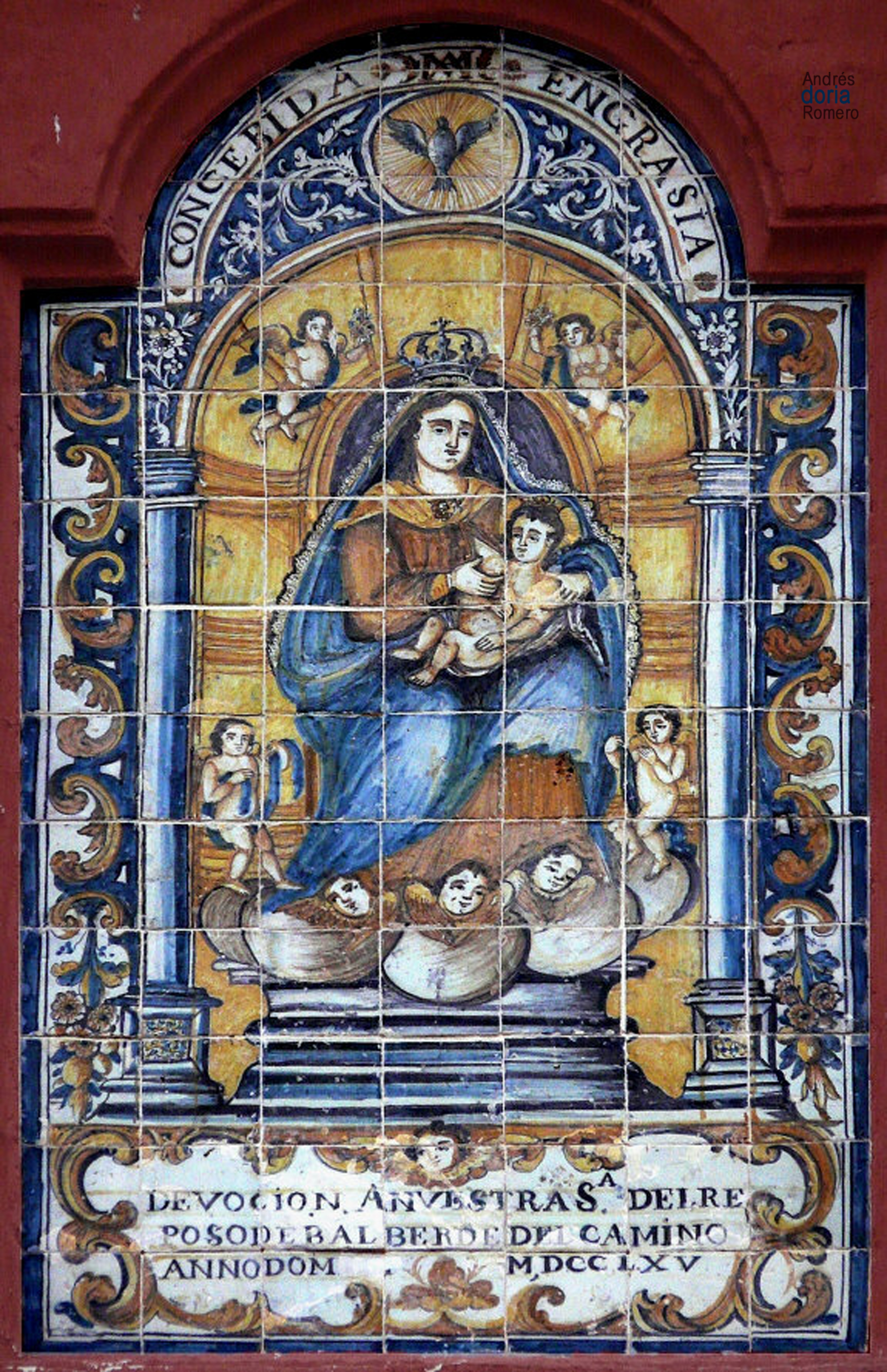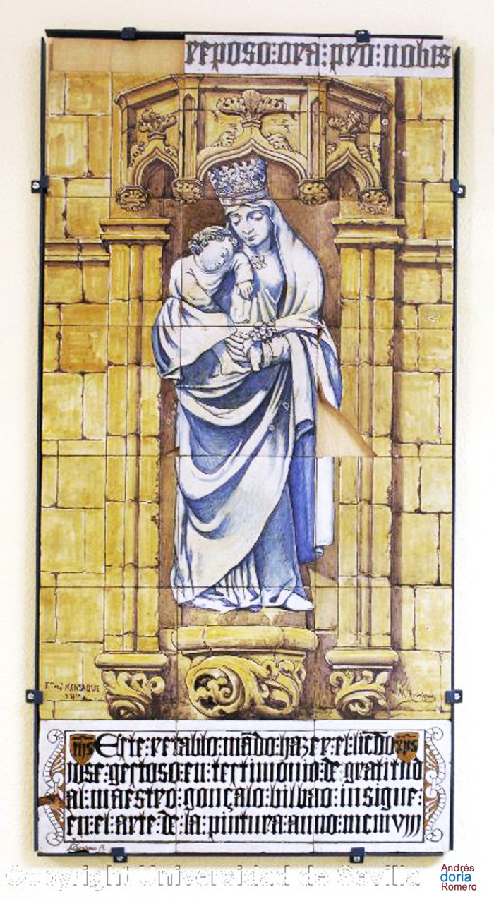 Tipología Cerámica Denominación Retablo de la Virgen del Reposo. Edifico de Gonzalo Bilbao Autor Rodríguez y Pérez de Tudela, M. Firma Si. «M. Rguez y Pérez de Tudela. Fca: J. Mensaque y hno» Cronología Año 1908 Estilo Neorrenacentista Escuela Trianera Tema iconográfico Retablo formado por 20 azulejos de tipo pisano que representa a la Virgen del Reposo (Trasaltar mayor de la Catedral de Sevilla) en su marco arquitectónico. Firmado y fechado en el anverso: «M. Rguez. y Pérez de Tudela/ Fca: J. Mensaque y hno.», «1908».