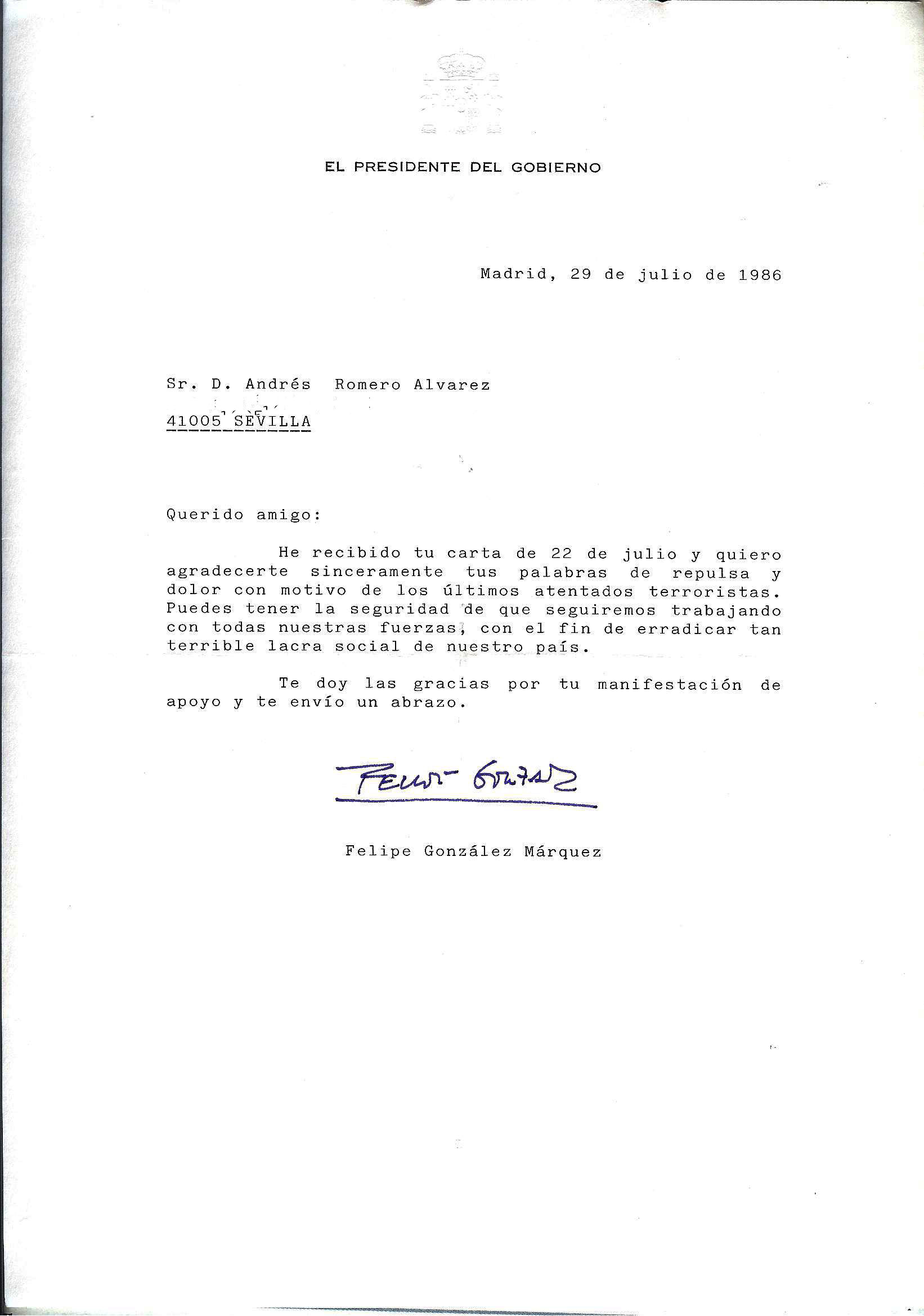 Ese mismo día escribí al Presidente del Gobierno, solidarizandome con él, mostrandole mi apoyo y deseandole suerte en su lucha contra el terrorismo, era lo único que podíamos hacer muchísimos ciudadanos angustiados, esta fue su respuesta.