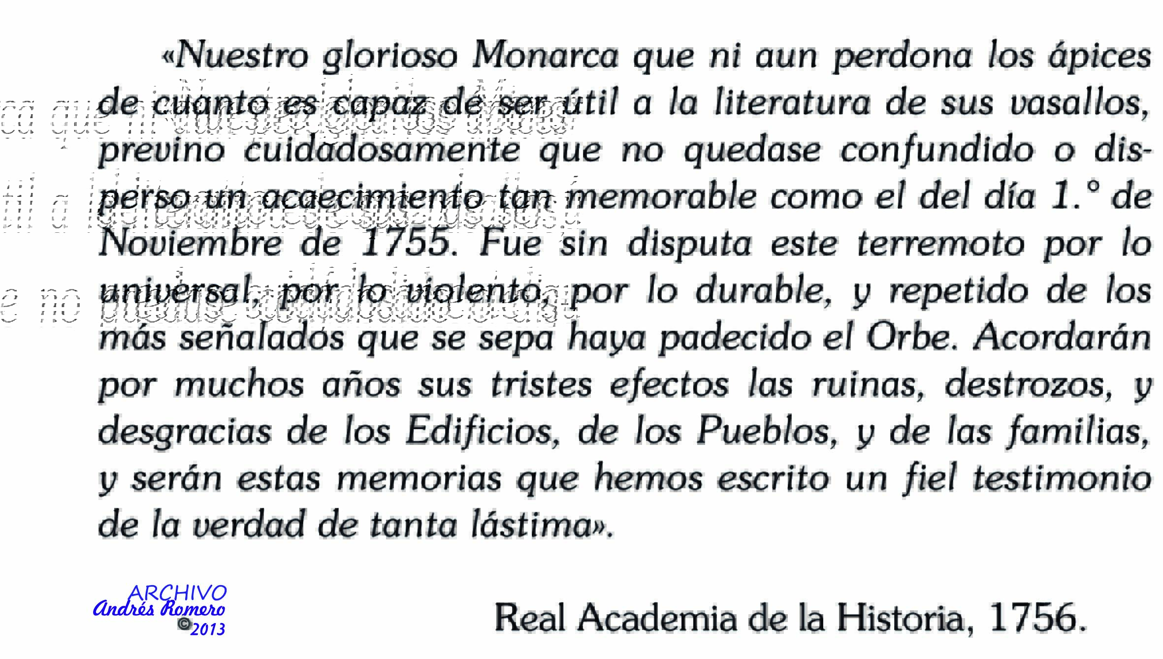 * Este temblor ha sido tan general, que se ha sentido en lo más de España, pero en ninguna parte ha hecho los estragos que en Andalucía y Portugal, donde se asegura que ha destruído casi enteramente a Lisboa, Faro, Castro-Marin [= Castro Marim] y a otros puertos, causando tanto daño como el que padeció dicha ciudad el año de 1531 [= el 26-I-1531. FRT].