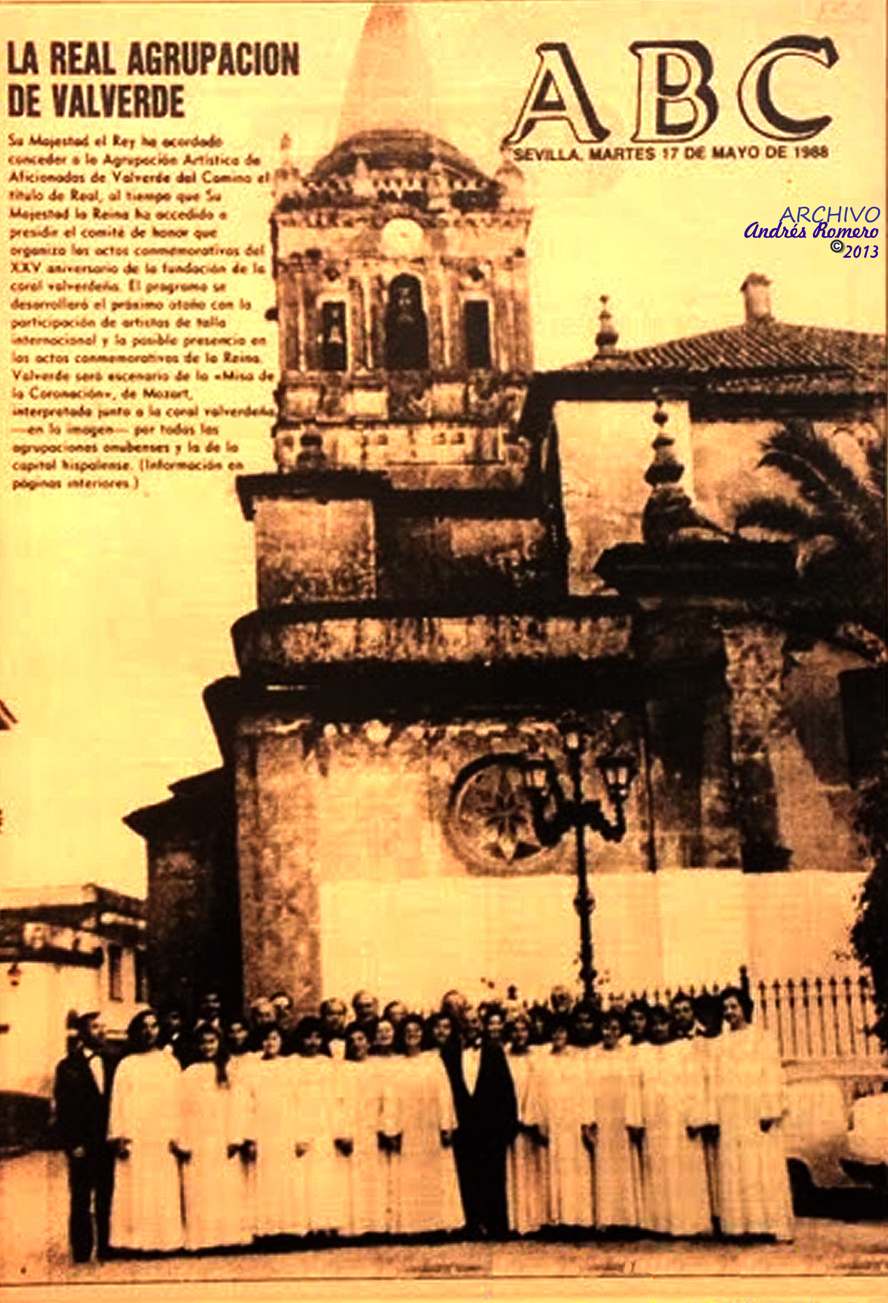 El 17 de mayo de 1988 el diario ABC de Sevilla, en su portada, hacía pública tan grata y honrosa noticia para la Agrupación y para todos los valverdeños .