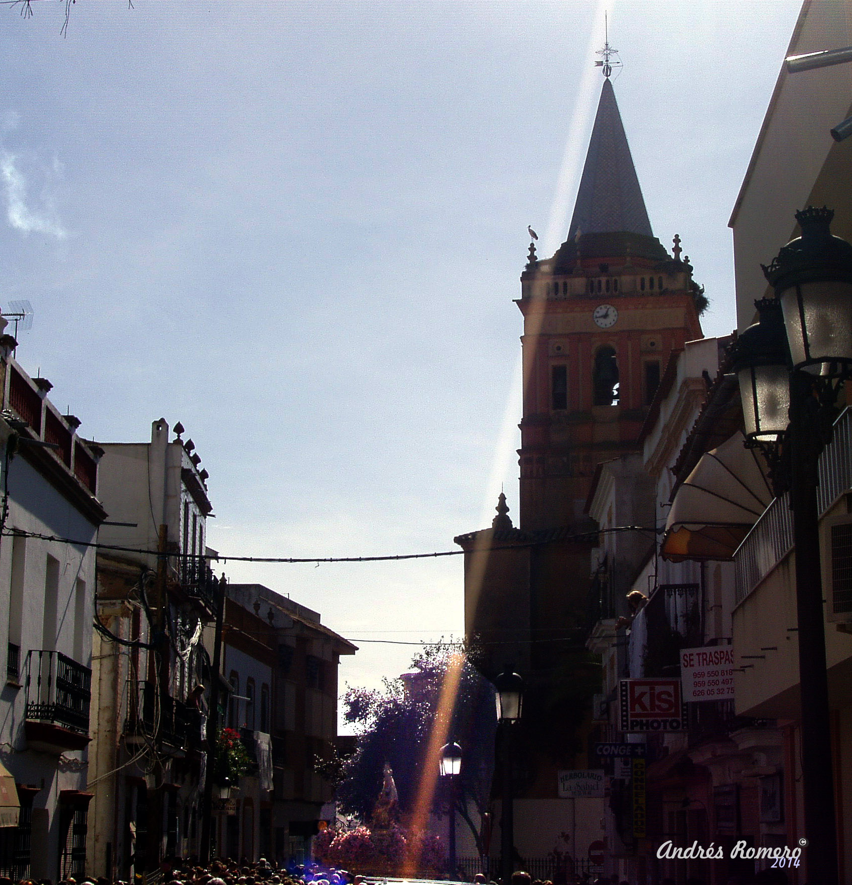Junto a Elena, mi mujer, y Ana Maria, mi cuñada, me encontraba en la puerta de lo que antes fue «la Drogueria SUR, frente a la taberna del Cuquillo. Desde allí mi mirada, fijada en la veleta de la torre, fue bajando siguiendo el haz de luz que el sol lanzaba, paralelo al capitel, hasta el florido trono de la Virgen. Volvió atrás mi vista, hacia arriba, hasta detenerse en la estampa que la silueta de una cigüeña posada sobre el «bolillo» del angulo izquierdo de la baranda que corona el campanario.
