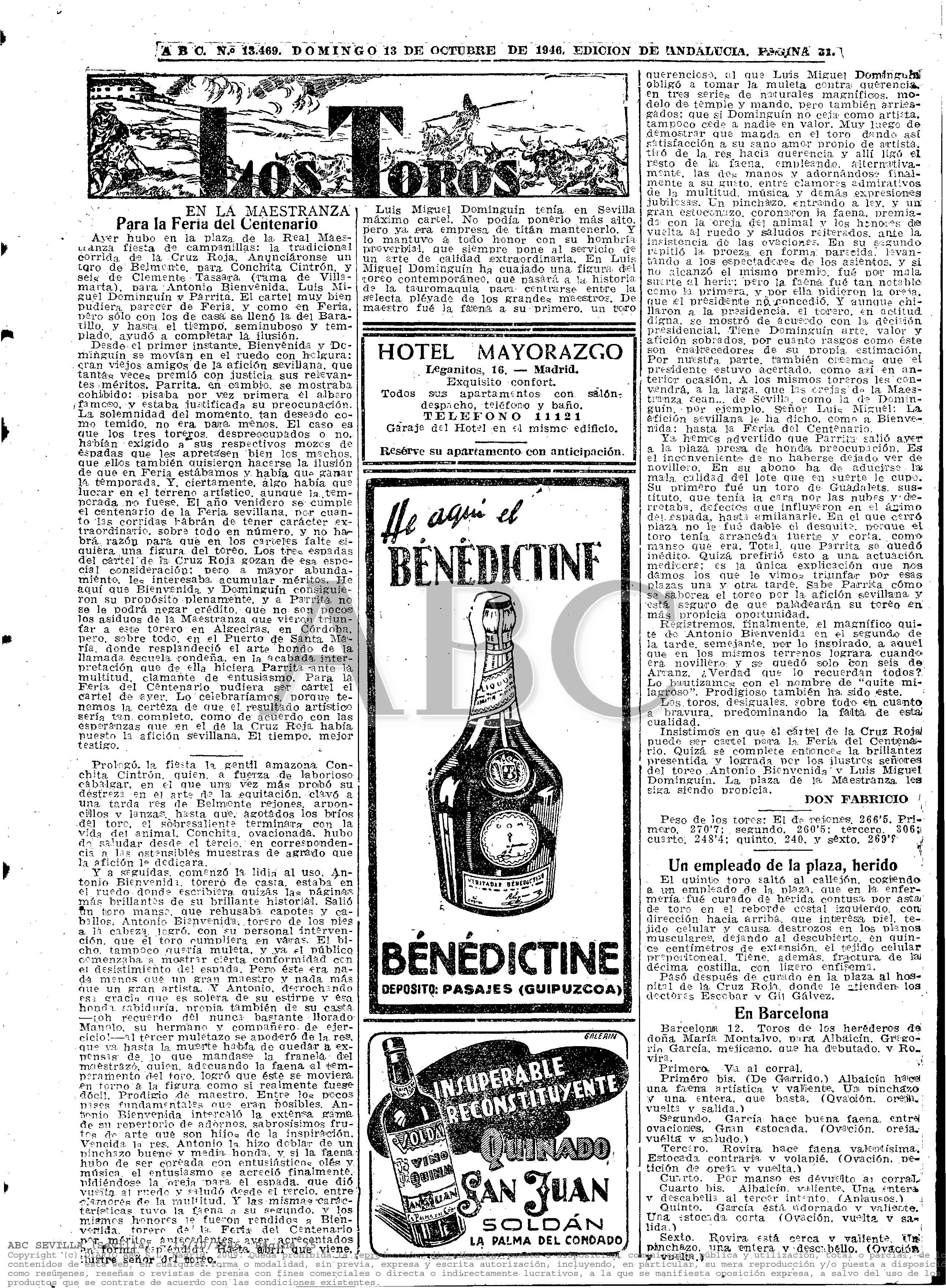He llegado a la conclusión que la corrida que debieron ver nuestros padres y que tan grato recuerdo dejó en nuestra querida madre debió ser la celebrada el 12 de octubre de 1946 en la Plaza de Toros de la Real Maestranza de Sevilla a beneficio de la Cruz Roja; Antonio Bienvenida, Luis M. Dominguín y Parrita con Conchita Cintrón abriendo plaza.