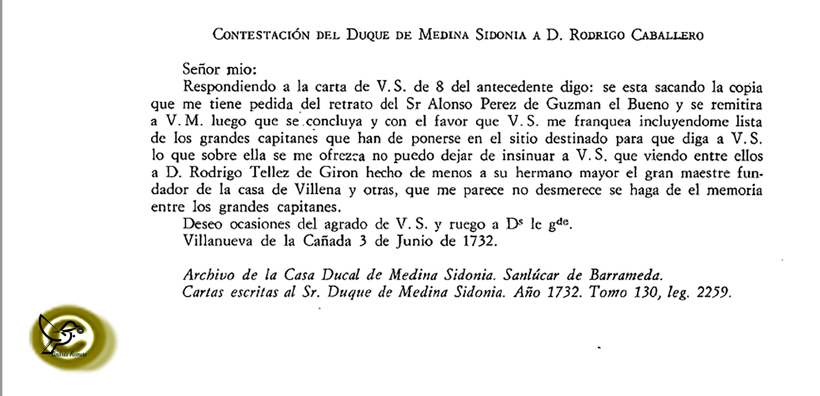 Dentro de la ejecución de este programa iconográfico resulta interesante advertir cómo el Corregidor don Rodrigo Caballero dio a entender al Duque de Medina Sidonia que si no llegaba a conseguir alguno de los dieciocho personajes que tenía proyectado incluir en el segundo pabellón, sus retratos habían que inventarse, siendo el rótulo de los mismos los que evocasen la memoria del héroe y no la efigie, al ser ésta fingida. Junto a la petición del retrato de don Alonso Pérez de Guzmán, el corregidor le envía una relación de los dieciocho personajes seleccionados para ese “Cuartel General”; sin embargo, esta lista no se archivó junto con la correspondencia, aunque probablemente incluía los mismos que actualmente figuran allí, excepto el de don Juan Pacheco, Marqués de Villena. En efecto, el Duque de Medina Sidonia, haciéndose eco de la petición de don Rodrigo Caballero de que le enviase alguna sugerencia sobre el conjunto de personajes seleccionado, notó la ausencia importante de don Juan Pacheco, Marqués de Villena. El Corregidor tomó buena nota de ello, puesto que tal personaje fue incluido finalmente en el programa iconográfico.
