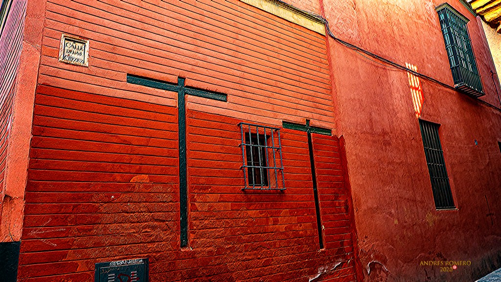 Las Cruces, allí siguen clavadas, a la entrada de la calle Cruces, esquina con Ximenez de Enciso, junto a la calle Fabiola, en el lindero mismo de la Judería y el Barrio de Santa Cruz de Sevilla.