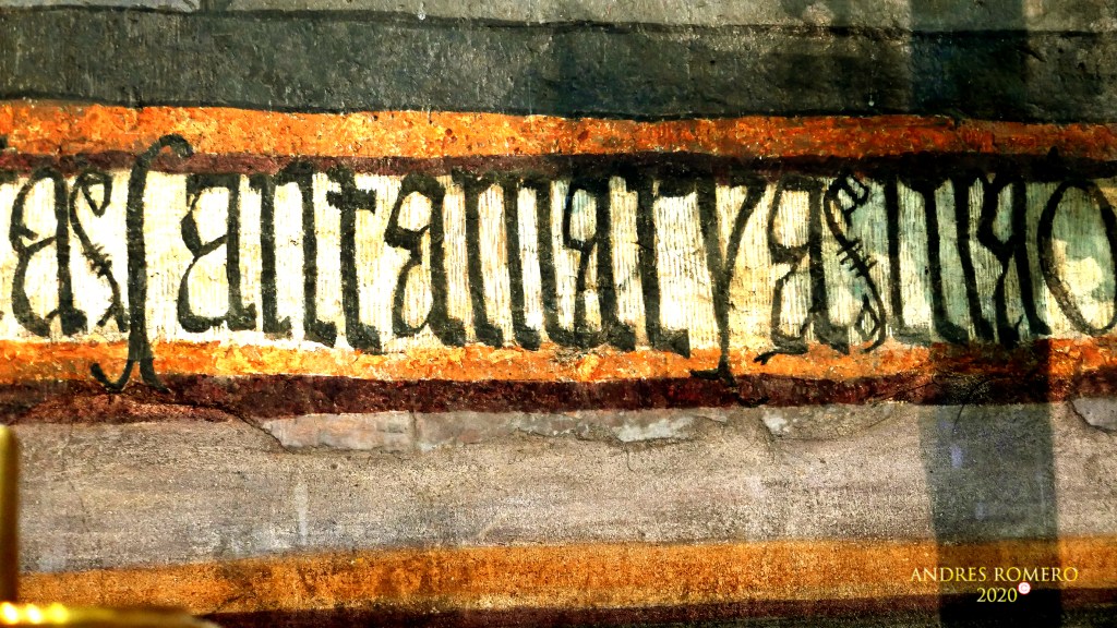 En la parte inferior , a ambos lado de la huella de la antigua mesa de altar, se conservan paños con motivos de lazo, conformando una especie de zócalo que corre también por el intradós y los rebasa a ambos lados del arcosolio. Es una composición de estrellas y lazos de cuatro y doce en tonos negro, ocre, lila y blanco. Sobre este zócalo corre un friso a modo de banco con dos registros en el que se desarrollan una inscripción que hemos podido leer parcialmente, aportándonos la fecha de realización de la obra y el comitente ; «Esta obra ma (n) do fazer P (edr)o Lopes. e su muger. aonra de dyos e de (…) bendy(t)a madre (…) señora . Santa marya ma(g)dalena cuyas a(d)bocacione(s) acabose a d(ie)z y ocho d(e)l mes. de mar(z)o o año de mylleq(uiniento)s e XXI años amen.»