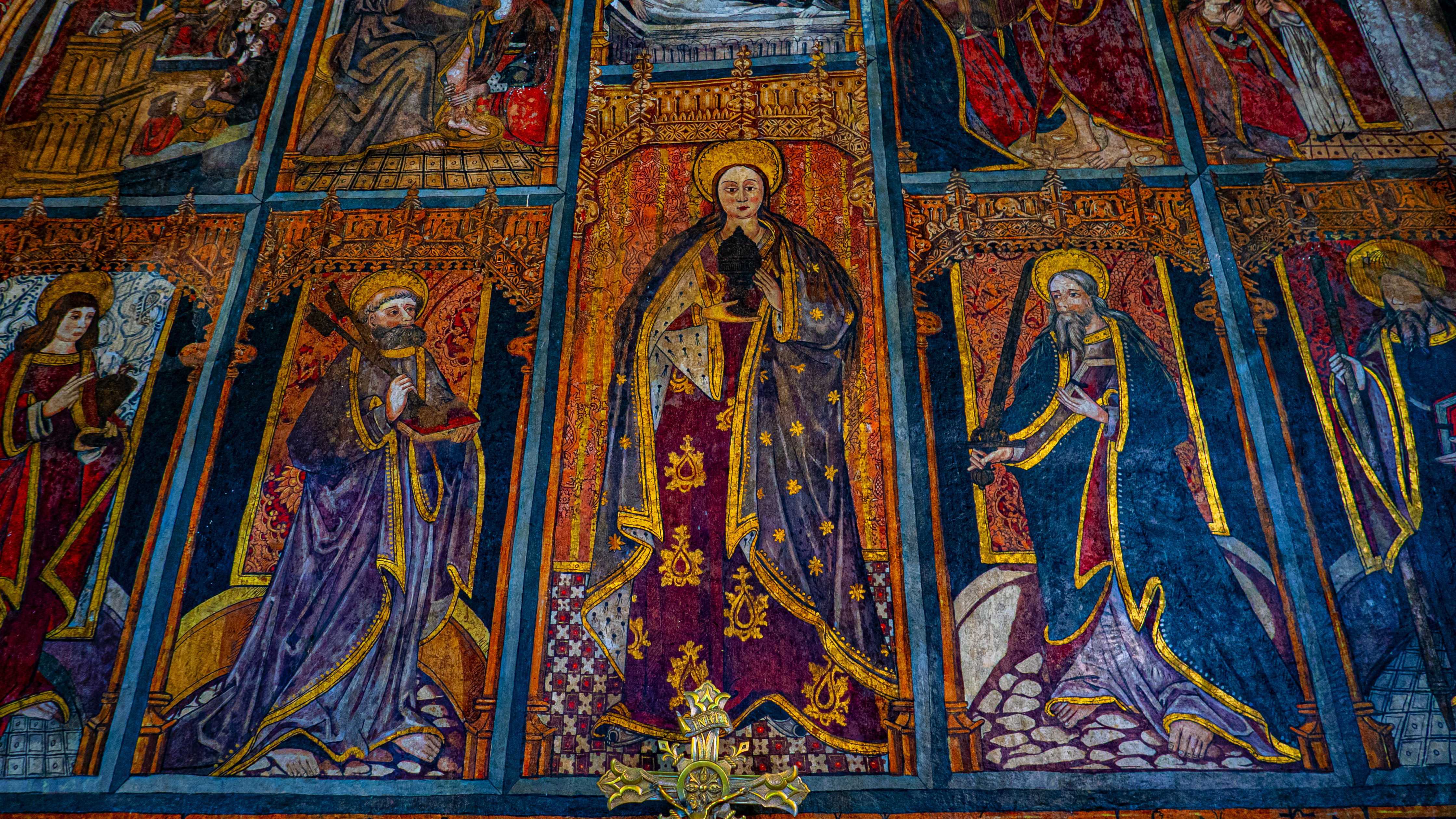 La calle central del retablo es algo más ancha y las alturas de sus registros no coinciden con las correspondientes a los laterales.