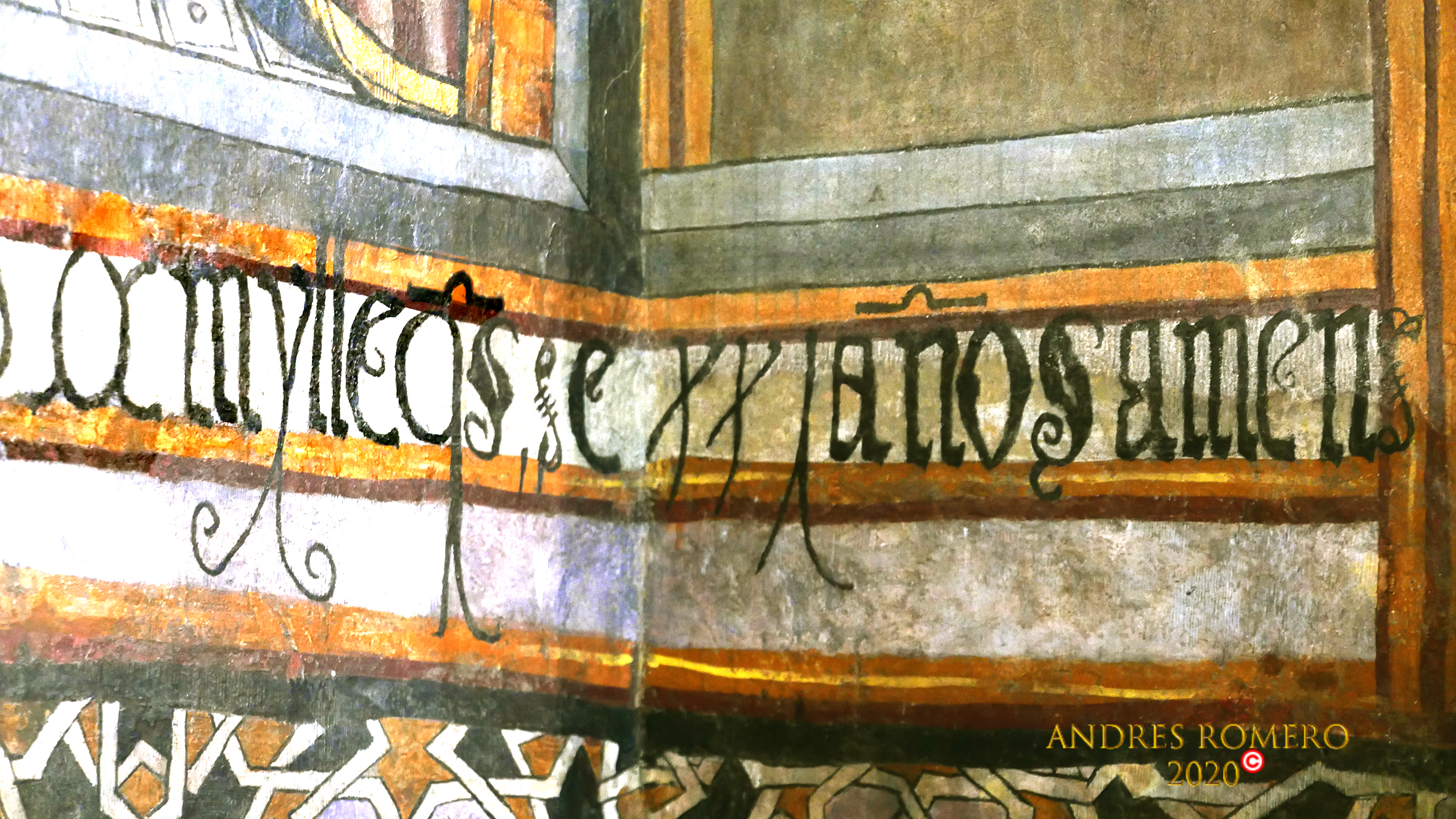 En la parte inferior , a ambos lado de la huella de la antigua mesa de altar, se conservan paños con motivos de lazo, conformando una especie de zócalo que corre también por el intradós y los rebasa a ambos lados del arcosolio. Es una composición de estrellas y lazos de cuatro y doce en tonos negro, ocre, lila y blanco. Sobre este zócalo corre un friso a modo de banco con dos registros en el que se desarrollan una inscripción que hemos podido leer parcialmente, aportándonos la fecha de realización de la obra y el comitente ; «Esta obra ma (n) do fazer P (edr)o Lopes. e su muger. aonra de dyos e de (…) bendy(t)a madre (…) señora . Santa marya ma(g)dalena cuyas a(d)bocacione(s) acabose a d(ie)z y ocho d(e)l mes. de mar(z)o o año de mylleq(uiniento)s e XXI años amen.»